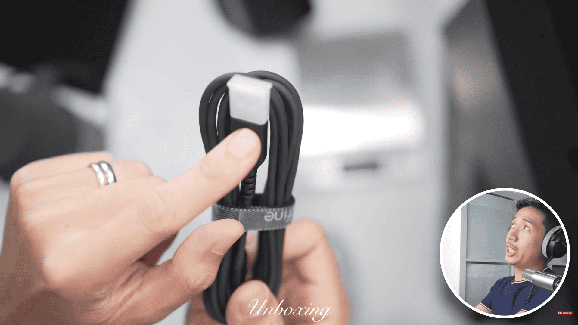 I should mention that it comes with a Type-A to Type-C USB-C cable with no adapters. So, for this review’s purposes, I’m going to use a separate Type-C to Type-C cable so it can connect directly into my MacBook Air.