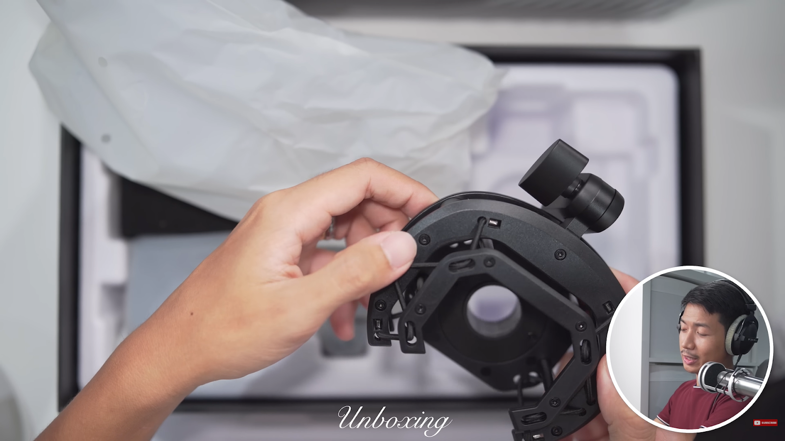 The shock mount. It looks pretty sturdy with high-quality plastic. It does come with a 3/8″ to 5/8″ thread adapter.